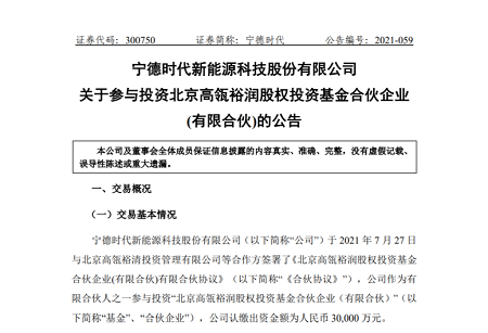 CATL은 유한(有限) 파트너로 이번 펀드 투자에 참여하며, 주로 산업 투자 기관의 우위를 빌려 전문화된 투자 관리팀을 통해 투자 채널을 확대하면서 사업 협력 및 발전 기회를 모색할 계획이다. 이를 통해 합리적인 투자 회수를 도모하고 회사의 발전과 주주의 이익을 꾀할 계획이다.