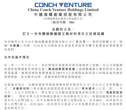 중국 콘치벤처(CONCH VENTURE)가 이주 공시를 통해 우후경제개발(芜湖经开)구 관리위원회와 리튬인산철(LFP) 배터리 양극재 공장 건설을 위한 투자 협약을 체결했다고 밝혔다.