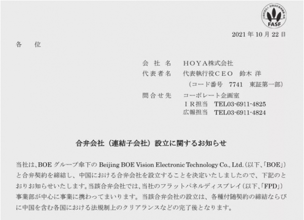 중국 시노리서치에 따르면 일본 호야가 BOE 산하 BOE비전일렉트로닉테크놀로지(BOE Vision Electronic Technology, BOE VT)와 중국에 합작사를 설립하기로 했다.