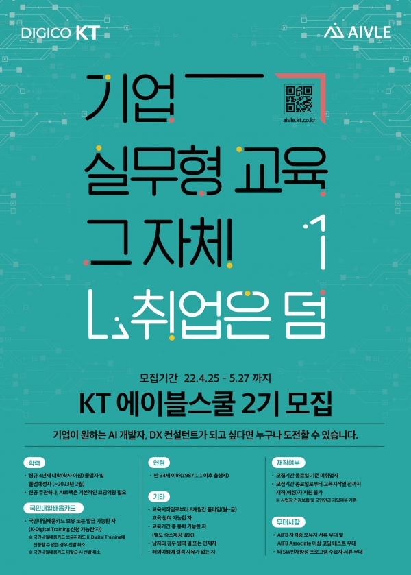 KT(대표 구현모, www.kt.com)가 25일부터 청년 AI 인재양성 프로그램 KT 에이블스쿨(KT AIVLE School) 2기 교육생 모집에 나선다.