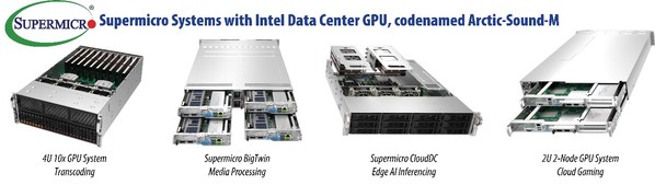 코드명 아크틱 사운드-M 인텔 데이터센터용 GPU를 탑재한 슈퍼마이크로 솔루션에는 트랜스코딩 및 미디어 딜리버리를 위한 4U 10xGPU 서버, 최대 8개의 인텔 데이터센터용 GPU를 탑재한 슈퍼마이크로 빅트윈(BigTwin) 시스템, 아크틱 사운드-M가 적용된 미디어 프로세싱 애플리케이션용 2U, 엣지 AI 추론을 위한 슈퍼마이크로 클라우드DC 서버, 클라우드 게이밍 최적화 위해 노드당 3개의 인텔 아크틱 사운드-M 데이터센터용 GPU를 탑재한 슈퍼마이크로 2U 2-노드 서버가 포함된다. 추가 시스템은 올 하반기에 제공될 예정이다.