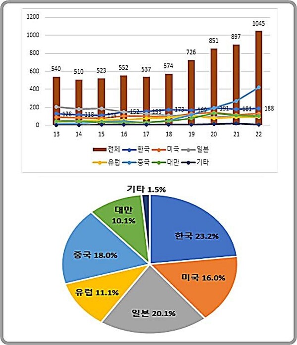 이 기간동안 마이크로 LED 기술 등록건수는 2013년 540건에서 2022년 1045건으로 두 배 가까이 증가하며 연평균 증가율 7.6%를 기록했다. IP5를 비롯해 대만, 기타 국가들의 등록건수를 모두 합치면 6755건으로 나타났다.