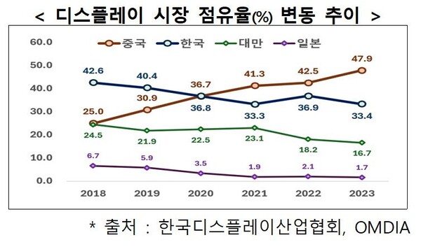이에 비해 지난해 중국 디스플레이 업계는 전년 대비 8.3% 늘어난 558억달러 매출을 기록하며 세계 디스플레이 시장 1위를 차지했다. 중국은 시장 점유율 기준 2021년 1위에 올라선 뒤 지난해 전년 대비 5.4%포인트 상승한 47.9%로 선두를 유지했다. 한국과 마찬가지로 대만(16.7%), 일본(1.7%)도 모두 전년보다 점유율이 하락했다. 중국만 나홀로 성장한 배경에는 애국 소비 열풍과 더불어 중국 정부가 현지 스마트폰 제조사 등에 자국산 부품 사용을 장려한 요인이 있다는 분석이다.