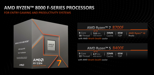 AMD가 기존 8000G 프로세서 제품군에 내장 그래픽이 탑재되지 않은 새로운 모델인 AMD 라이젠 7 8700F(AMD Ryzen™ 7 8700F) 및 AMD 라이젠 5 8400F(AMD Ryzen™ 5 8400F) 프로세서를 출시했다고 16일 밝혔다.