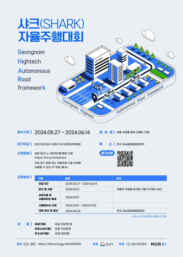 자율주행 시뮬레이션 전문기업 모라이(대표 정지원, 홍준)가 성남산업진흥원과 '샤크(SHARK, Seongnam Hightech Autonomous Road frameworK)' 가상 시뮬레이션 플랫폼에서 자율주행 기술 역량을 겨루는 ‘샤크(SHARK) 자율주행대회’를 개최한다고 28일 밝혔다.