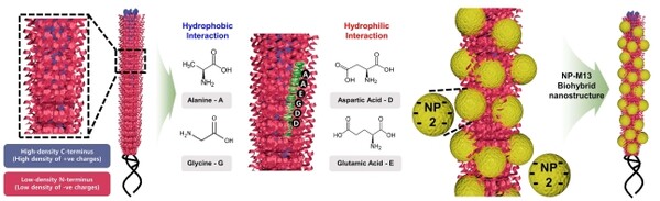 연구팀은 이를 개선하고자 금속나노입자를 균일하고 질서정연하게 배치하는 특성을 가진 바이오 물질 ‘M13박테리오파지’를 합성했다. M13 박테리오파지는 금속 양이온과 결합하는 활성기를 가져, 모든 금속 양이온을 일정하게 배열한다.