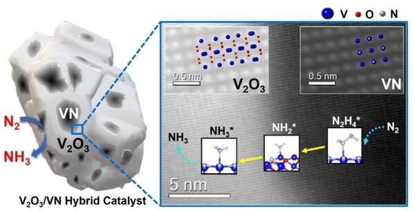 심 교수 연구팀은 V2O3와 VN이 이종 계면에서 일관되게 공존하는 산화바나듐/질화물(V2O3/VN) 하이브리드 전기촉매를 설계, 개발했다.