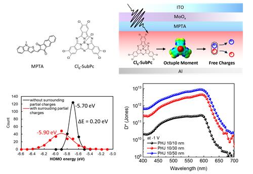 박 교수는 이번 연구에서 서브프탈로시아닌 화합물(Cl6-SubPc) 재료의 높은 팔중극자 모멘트가 빛 조사 시 자유 전하 생성에 핵심적인 역할을 한다는 연구 결과를 밝혔다.