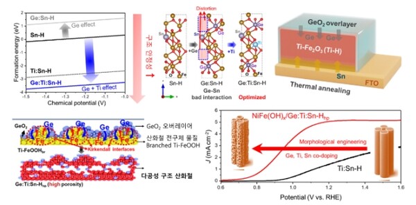 UNIST 연구진은 이를 개선하기 위해 산화철의 구조적 특성에 주목했다. 게르마늄(Ge), 티타늄(Ti), 주석(Sn)을 함께 섞어 산화철의 전기적 특성을 개선했다. 또 열을 이용해 다공성 구조를 만들어 반응 면적을 넓히고 전자 이동 거리를 줄였다. 이를 통해 산화철의 단점을 극복하고 물 분해 효율을 높일 수 있었던 것.