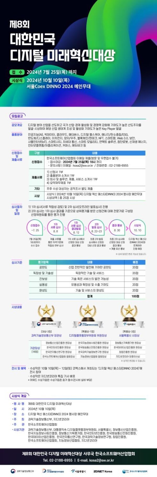 시상은 오는 10월 10일(목) 디지털 혁신 페스타(DINNO) 2024에서 개최될 예정으로 이번 시상식에서는 대상과 특별상을 비롯해 총 25점의 수상이 이뤄진다.