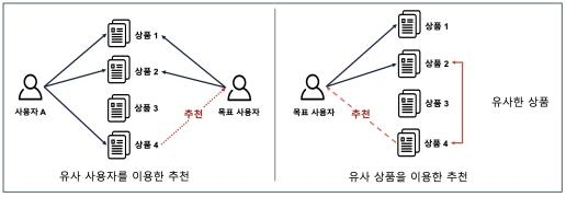 협업 필터링은 유사 사용자 기반 추천, 유사 상품 기반 추천으로 이뤄진다. 목표 사용자와 비슷한 이력을 갖는 사용자가 상호작용한 상품을 추천하거나, 목표 사용자가 상호작용한 특정 상품과 유사한 상품을 추천하는 방식이다.