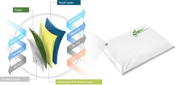 이 교수팀은 기존 종이 포장재의 단점을 극복하기 위해 PVA(폴리비닐알코올)를 종이에 코팅한 친환경 종이 포장재를 개발했다. PVA는 산소 등 기체를 효과적으로 차단하지만 물에는 쉽게 용해된다. 연구팀은 PVA에 고분자 변성 기술과 금속 이온을 활용해 빠르게 굳고 물에도 강한 코팅제를 개발했다.