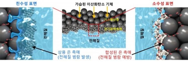 한국과학기술연구원(KIST·원장 오상록)은 청정에너지연구센터 오형석·이웅희 박사팀이 반도체기술연구단 황규원 박사팀, LG화학 노태근 박사 연구팀과 공동연구를 통해 이산화탄소 포집 장치의 전해질 범람을 억제할 수 있는 소수성 지질 유기물이 표면에 결합된 은 나노 촉매를 개발했다고 14일 밝혔다.