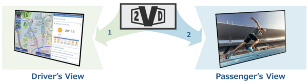 자동차 내에서는 센터페시아 화면 하나로 운전자에게는 내비게이션 화면을, 조수석에는 유튜브⋅넷플릭스 등 동영상 서비스 화면을 보게 할 수 있다. 2VD 기술을 활용함으로써 디스플레이를 탑재하기 위한 공간을 반으로 절감할 수 있을 뿐만 아니라 비용 역시 줄어든다.