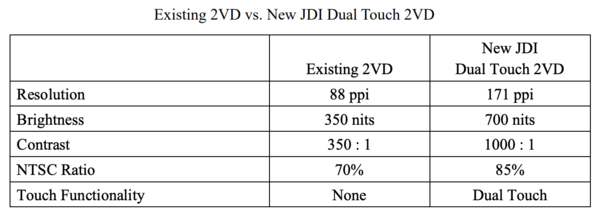 JDI에 따르면 이 회사가 개발한 2VD 화면은 171 PPI(1인치 당 픽셀 수)에 700니트의 디스플레이 휘도를 구현했다. 명암비는 1000대 1, NTSC 비율은 85%를 각각 달성했다. 특히 기존 2VD 기술이 터치스크린 탑재는 어려웠던 반면, JDI는 터치 방향을 인식해 운전자와 조수석 탑승자 모두 쓸 수 있는 터치 기술을 구현했다. 2VD 디스플레이 터치가 어떤 방식으로 터치 방향을 인식하는지는 공개되지 않았다.