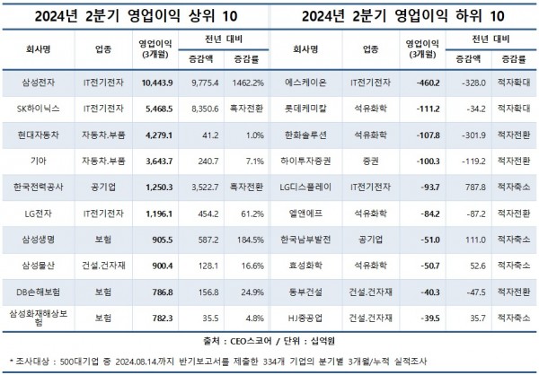 기업별로는 반도체 양강이 실적 상승세를 이끌며 뚜렷한 온도차를 보였다. 삼성전자가 2분기 영업이익 10조4439억 원을 기록해 1위를 차지했다. 이중 삼성전자의 반도체 사업인 디바이스솔루션(DS) 부문의 영업이익은 6조4500억 원이다. SK하이닉스가 5조4685억 원으로 뒤를 이었다. 이들 두 기업이 조사 대상 기업 전체 영업이익의 약 27%를 차지한 셈이다.