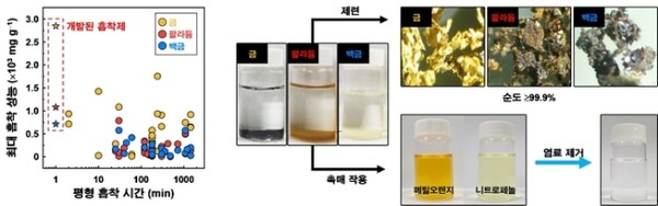 새로운 고분자 흡착제는 기존 상업용 고분자 및 환원제, 흡착제 대비 성능과 속도가 우수해 유가금속 환원 흡착을 촉진한다.
