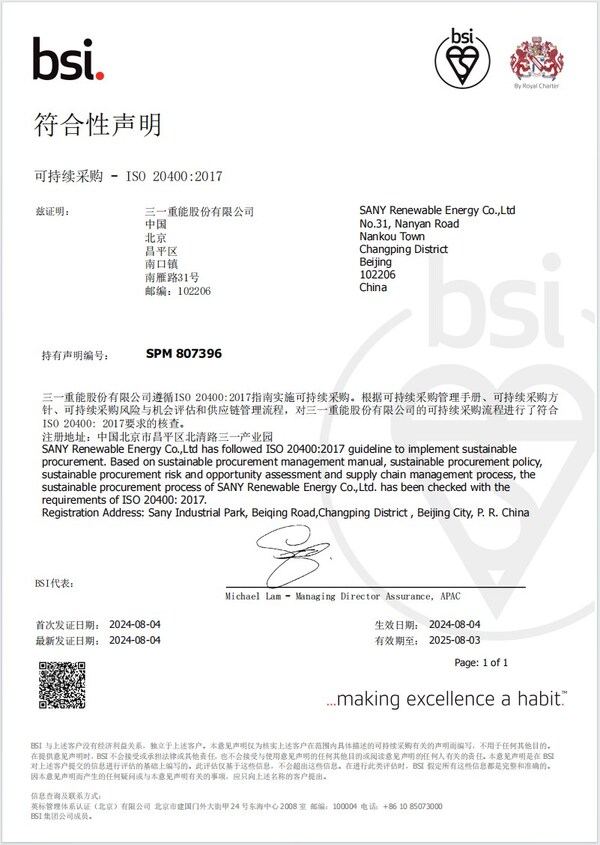 상하이 2024년 8월 27일 /PRNewswire/ -- 풍력 발전 부문의 선도기업인 사니 재생에너지가 영국표준협회(BSI)의인증을 획득하는 중대한 이정표를 달성했다. 사니 재생에너지는 이번 인증을 통해 업계 최초로 ISO 20400 지속가능한 조달 준수 성명(ISO 20400 Sustainable Procurement Compliance Statement)을 받았다. 제품, 서비스 및 시스템에 대한 표준 및 품질 분야의 선도적인 글로벌 기관인 BSI는 지속가능한 조달 관행을 경영에 통합하여 지속가능한 개발을 위한 글로벌 벤치마크를 설정하는 기업을 인증하는 곳이다.