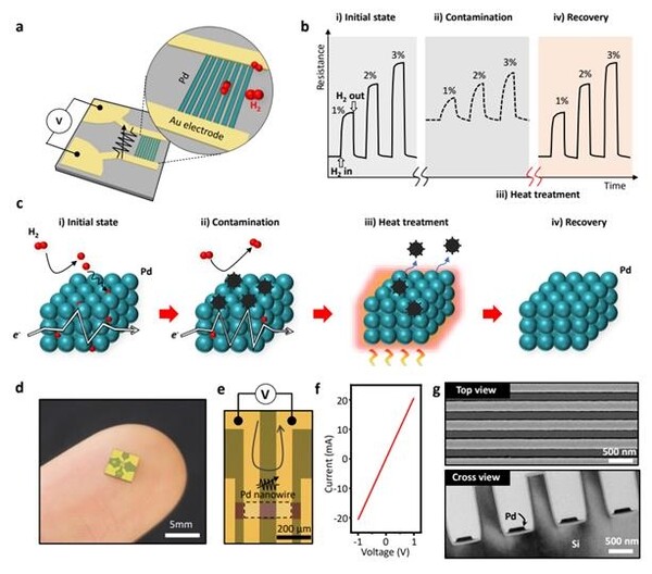 무색·무취한 수소는 4% 농도 이상일 때 매우 높은 폭발성을 띠어 안전 관리가 필수적이다. 연구진은 반도체 기반 마이크로기계전자시스템을 적용해 손톱 크기의 초고성능 팔라듐 수소 센서를 제작, 2달 이상 대기 중 방치된 후에도 열처리만으로 초기 성능을 완벽하게 되살리는 데 성공했다.