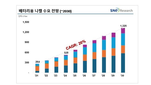 시장조사 업체 SNE리서치는 '2024 Battery nickel metal report(~2030)'를 통해 배터리 생산에 사용되는 니켈의 수요가 2024년 53만 톤에서 2030년 133만 톤으로 늘어날 것이라고 28일 예측했다.