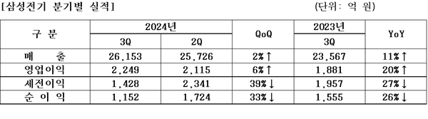 삼성전기는 지난 3분기 연결기준 매출 2조 6,153억 원, 영업이익 2,249억 원을 각각 기록했다고 29일 밝혔다.