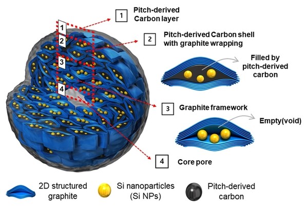 공동 연구팀은 '흑연-실리콘-카본' 복합체를 개발했다. 이 복합체는 메카노퓨전(MF) 공정으로 제작되는 과정에서 실리콘 입자를 2D 구조의 흑연이 안정적으로 감싸게 되고 피치 유래 탄소 껍질이 전체 구조를 강화하는 역할을 한다.