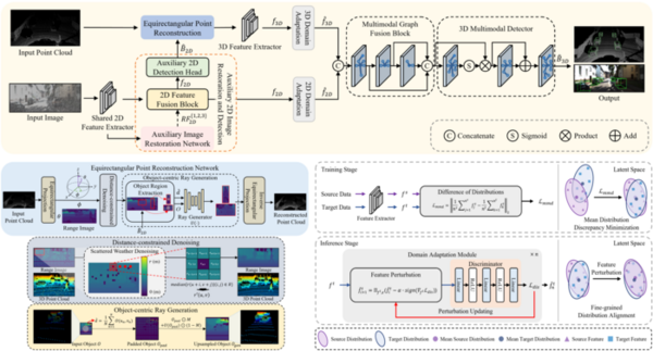 연구팀은 '구형 투영(equirectangular projection)'을 이용한 포인트 복원 네트워크를 제안했다. 이는 레인지맵의 거리 기반 날씨 잡음 제거 기술과 객체 중심의 고밀도 레이 생성 네트워크로 구성돼 있다. 성능을 높이기 위해 특징 맵 변형 주입을 통한 도메인 적응 기법을 도입해 데이터셋 간의 차이를 줄이고 다양한 환경에서의 강건성을 높였다. 멀티모달 날씨 잡음 매칭 기법을 통해 실제와 유사한 학습 데이터를 생성하고, 합성된 포인트 클라우드와 이미지 사이의 날씨 잡음을 정렬해 더욱 현실적인 데이터 학습 환경을 제안했다.