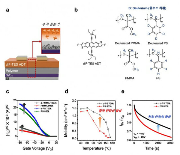 연구팀은 중수소를 포함한 절연성 고분자(PMMA, PS)를 유기 반도체와 혼합해 새로운 방식의 상분리 구조를 제안했다. 이를 통해 활성층에 중수소를 직접 도입하지 않아도 고이동도와 열적 안정성은 물론, 지속적인 전압에 따른 성능 안정성을 동시에 개선할 수 있었다.