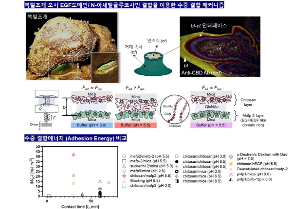 연구팀은 연구를 통해 복털조개가 갖고 있는 N-아세틸글루코사민(GlcNAc)이 풍부한 족사1) 기반의 고분자와 EGF 또는 유사한 단백질이 결합해 수중에서도 뛰어난 접착력을 만들며 이 접착력은 기존 홍합 단백질(mefp-5), 거미 단백질(suckerin)에 비해 접착력이 3배 이상 우수한 사실을 밝혀냈다.