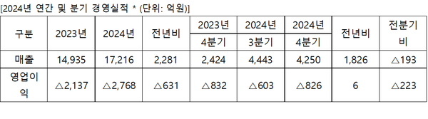 SKC(대표 박원철)가 2024년 연결기준 매출액 1조7,216억원, 영업손실 2,768억원을 각각 기록했다고 11일 공시했다.