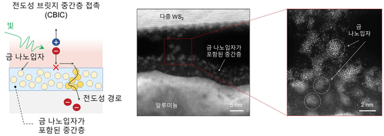 한국과학기술연구원(KIST) 차세대반도체연구소 양자기술연구단 황도경 박사(고려대학교 KU-KIST 융합대학원, 학연교수)와 박민철 박사 공동 연구팀은 혁신적인 전극 소재인 'Conductive-BridgeInterlayer Contact(CBIC)'을 개발하여 높은 광신호 효율을 갖춘 2차원 반도체 기반 이미지 센서를 구현하는 데 성공했다. 연구팀은 전극 내부에 금 나노입자를 형성해 전극의 저항을 획기적으로 낮추는 데 성공함으로써 2차원 반도체 이미지 센서의 성능을 크게 향상시켰다. 또한, 기존 전극 소재에서 발생하던 페르미 준위 고정 현상 문제를 효과적으로 해결해 센서의 광신호 효율을 한층 높였다.