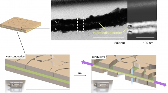 연구팀은 금속 나노 박막 사이 소프트 나노 베리어(barrier) 층을 삽입하는 방식으로, 신축 인장 시 10⁹ 배에 달하는 음의 저항 변화 구현에 성공했다. 일반적으로 신축 인장 시 재료의 저항 증가는 일반적 현상이다. 연구팀은 이와 반대로 신축 시 저항이 감소하는 새 소재를 개발했다.