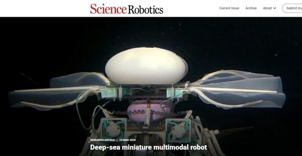 25일 중국중앙TV(CCTV) 등에 따르면 중국 연구진이 개발에 성공한 '심해 미니어처 다(多)모드 로봇'이 국제 학술지인 '사이언스 로보틱스' 홈페이지 메인에 지난 19일(현지 시간) 소개됐다.