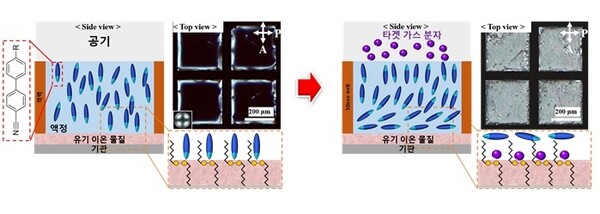 연구팀은 이 문제를 해결하기 위해 액정에 '유기 이온 물질(Organic Ionic Plastic Crystals)'을 더했다. 이 물질은 전하를 띠는 분자로 구성돼 있는데, 연구팀은 물질 구조를 정밀하게 설계해 특정 가스에 선택적으로 반응하도록 만들었다.