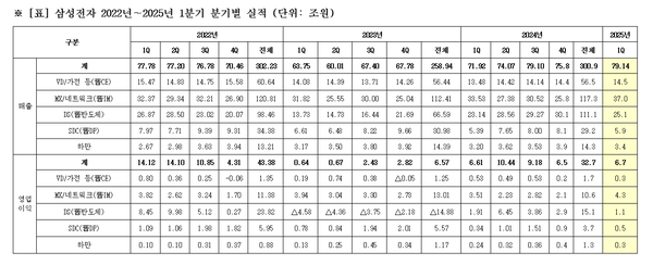 영업이익의 경우 DS부문의 실적 하락에도 불구하고 갤럭시 S25 시리즈 판매 호조와 VD 및 가전 사업의 고부가 제품 중심 판매 확대로 전분기 대비 0.2조원 증가한 6.7조원을 나타냈다.