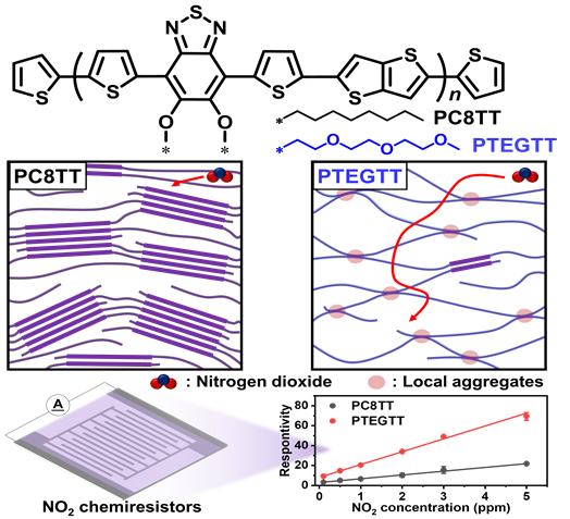 고감도 고분자 센서의 개발에 있어 기존 공정에서 가장 큰 난관으로 존재해온 ‘결정성-확산성 간의 상충’을 위해 연구팀은 유기화합물인 에틸렌글리콜 기반의 측쇄(곁사슬) 구조를 도입해 고분자의 결정성을 낮추고, 사슬 간 전자 이동을 촉진하는 국소적 응집체(localized aggregates)를 유도하는 방식으로 설계를 진행했다.