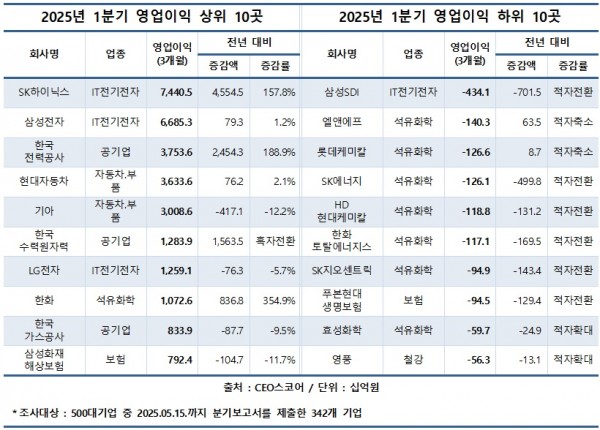 업종별 증감폭에서는 IT 전기·전자가 4조6598억원으로 가장 크게 늘었고, 뒤이어 공기업(4조2854억원), 조선·기계·설비(1조4072억원), 제약(3875억원), 통신(2857억원), 증권(1943억원), 유통(1677억원), 철강(520억원) 순이었다. 이에 비해 영업이익이 많이 감소한 업종은 석유화학(-9983억원), 보험(-7050억원), 에너지(-2390억원), 건설·건자재(-1963억원), 자동차·부품(-1590억원) 순으로 나타났다.