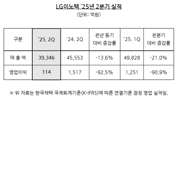 LG이노텍(대표 문혁수)은 한국채택 국제회계기준(K-IFRS)으로 2025년 2분기 매출 3조 9,346억원, 영업이익은 114억원을 기록했다고 23일 밝혔다. 전년 동기 대비 매출은 13.6%, 영업이익은 전년 대비 92.5% 감소했다.