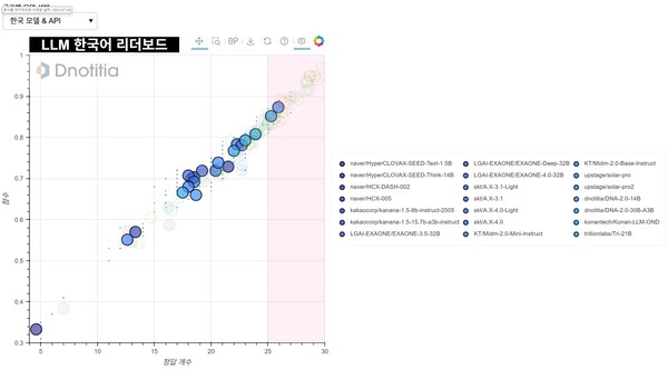 또 디노티시아는 LLM들의 한국어 기반 성능을 객관적으로 평가할 수 있는 벤치마크를 만들어 ‘LLM 한국어 리더보드’ (https://leaderboard.dnotitia.com/)를 오픈했다. 자체 구축한 한국어 중심 평가 데이터셋을 기반으로 다양한 상용 모델 및 오픈소스 모델들을 동일한 조건에서 비교 테스트해 LLM의 한국어 처리 능력을 객관적으로 평가할 수 있도록 했다. 이번에 공개하는 DNA 2.0모델은 본 리더보드를 통해 파라미터 규모가 유사한 국내 모델들 중 가장 뛰어난 성능을 보이기도 하였다.