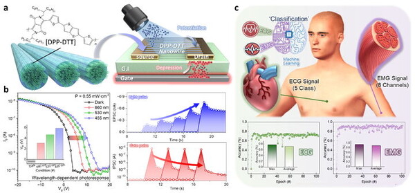 한양대 융합전자공학부 유호천 교수 연구팀이 'DPP-DTT(디케토피롤로피롤-디티에닐티에노[3,2-b]티오펜, diketopyrrolo-pyrrole-dithienylthieno[3,2-b]thiophene) 나노와이어 기반 광 시냅스 트랜지스터'를 개발했다고 14일 밝혔다.
