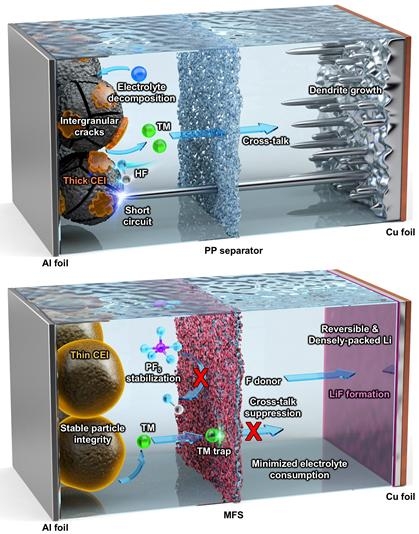 그 결과 리튬 금속이 쌓이는 음극에서는 리튬 플루오라이드(LiF) 보호층이 고르게 만들어져 덴드라이트 생성을 막았다. 양극에서는 해로운 불화수소(HF) 생성을 차단해 전극이 무너지는 것을 막았다. 한 장의 얇은 분리막이 양극과 음극을 동시에 안정화하는 '이중 보호막' 역할을 한 것이다.