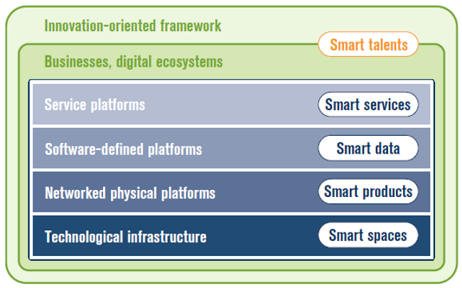 디지털 인프라의 최하위 계층인 ‘기술 인프라(Technical Infrastructure)’는 스마트 스페이스로, 지능형 환경을 말한다. 이런 환경에서 지능적이고 디지털로 연결이 가능한 사물, 기기, 기계(스마트 제품)가 네트워크로 연결된다. 전제 조건은 이를 위한 성능 좋은 기술 인프라 기반이다. 광대역 네트워크가 전국으로 확산돼야 한다. 뿐만 아니라 영역별로 특화해 지연시간에 대해 보증해야 데이터 분석과 이 분석에 기반을 둔 스마트 서비스를 실시간으로 제공할 수 있다. 기술 인프라는 조만간 다가올 경제 및 사회 패러다임 전환에서 시스템적으로 중요한 역할을 한다.