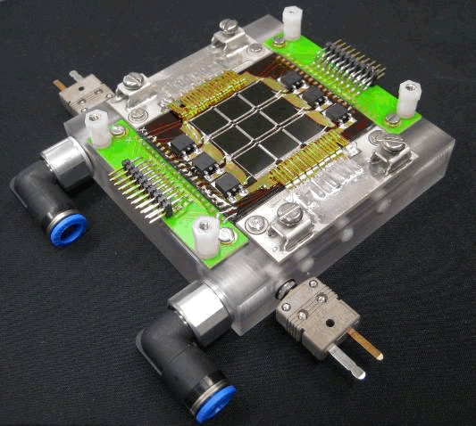 The entire receiver combines hundreds of chips and provides 25 kilowatts of electrical power. The photovoltaic chips are mounted on micro-structured layers that pipe liquid coolants within a few tens of micrometers off the chip to absorb the heat and draw it away 10 times more effective than with passive air cooling.