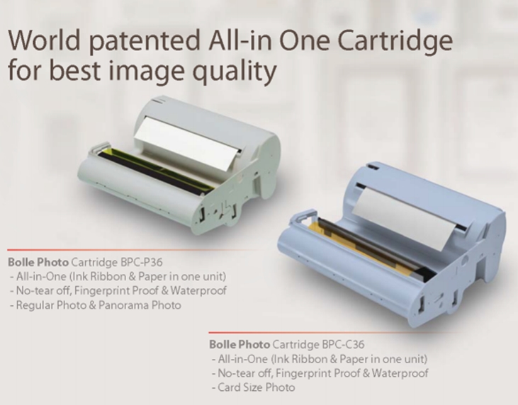 Bolle Photo cartridge is unique for its features and usability. Coming integrated with ink ribbon and paper into one unit, it is a sort of all-in-on-type printing cartridge.