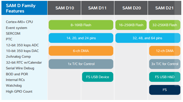The SAM D portfolio is architected beyond the core, using over two decades of Atmel’s MCU experience to create unique, connected peripherals that work flawlessly with the ARM Cortex-M0+ CPU, are easy-to-use, and provide scalability and performance. To help simplify the design process and eliminate the need for additional components, Atmel’s new families also integrate additional functionality including full-speed crystal-less USB, DMA, I2S, timers/counters for control applications, and several other new features. Atmel’s SAM D devices are code- and pin-compatible making it easy for designers to migrate up and down the family.